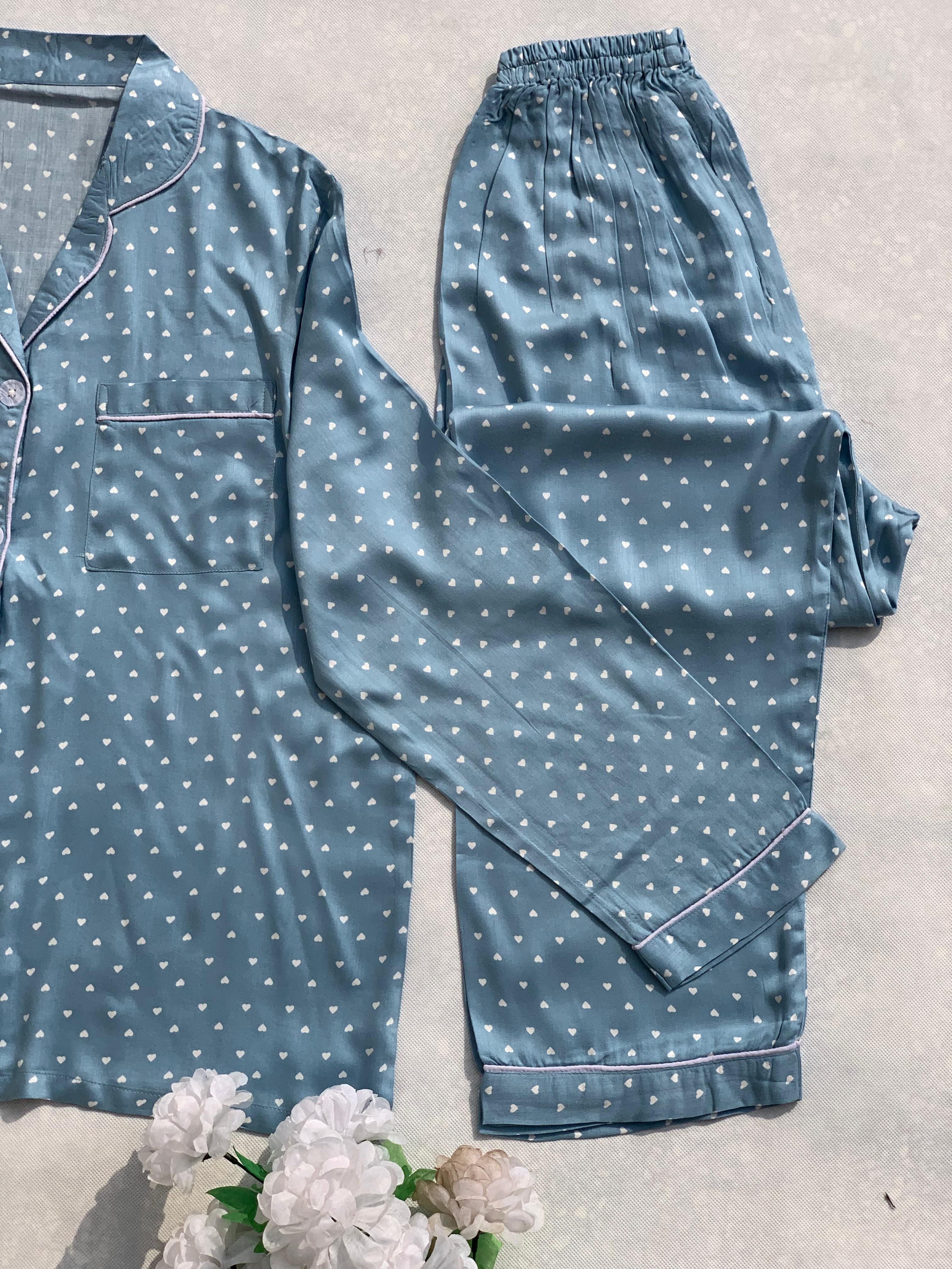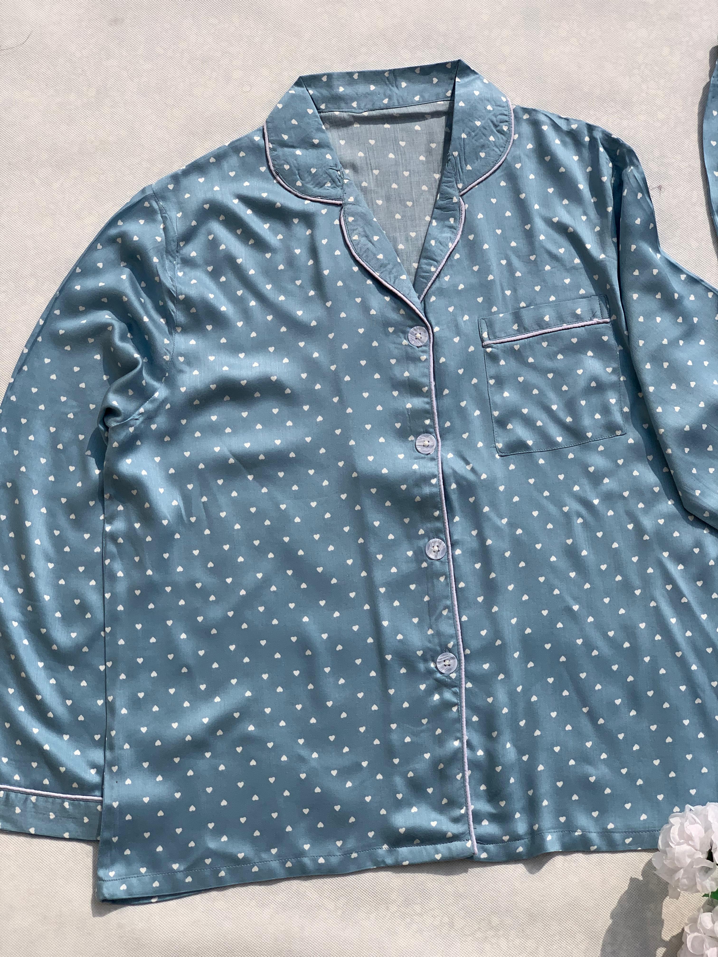 Breathable Mist Blue linen pajama set in an updated style. Notch collar. Button through opening. Full sleeves. Front patch pocket. White piping details. Loose fit trousers with elasticated waistband.