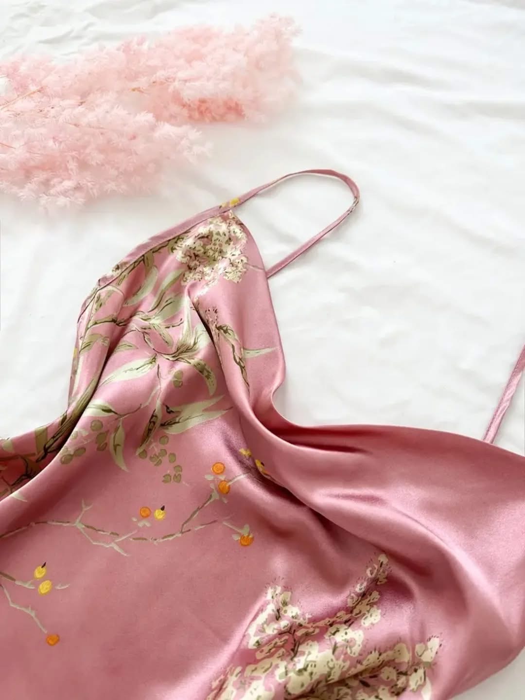 Smooth cherry printed imported satin silk camisole and trouser set in rich tones.