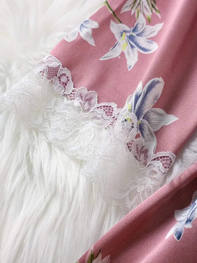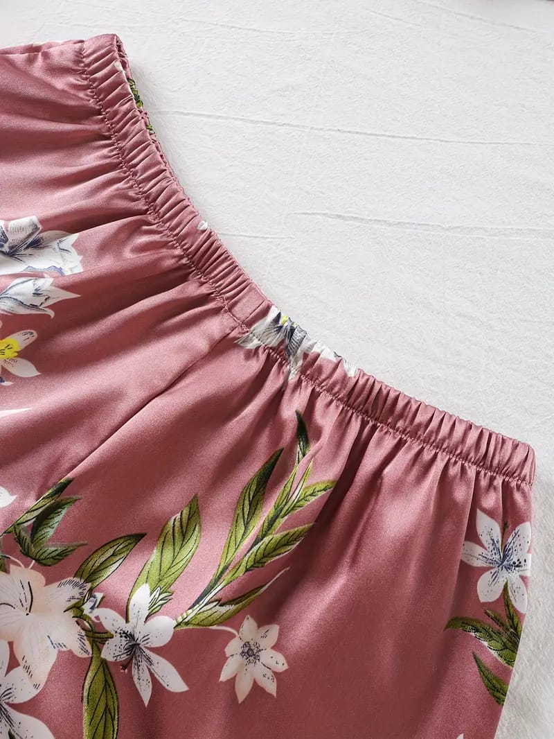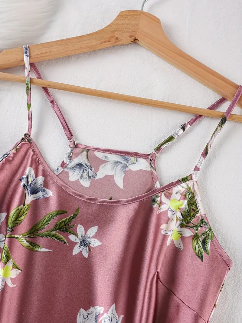 Elegant dust pink 4pcs printed Silk nighty with a printed silk night gown, camisole with long and short pants.