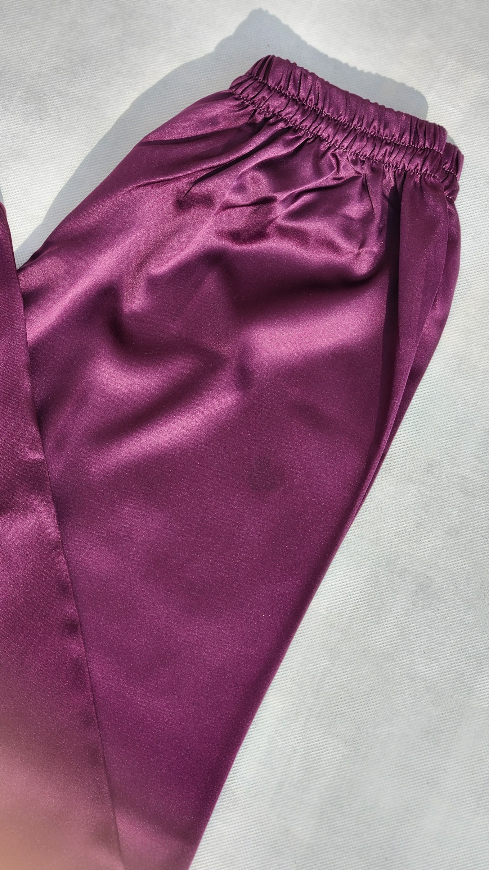 Colour: Maroon Fabric: Imported satin silk The top features: 1. Long sleeves 2. A button-down front with purple contrasting buttons 3. A notch collar 4. White piping along the collar, button placket, cuffs, and chest pocket 5. A small left chest pocket with matching piping